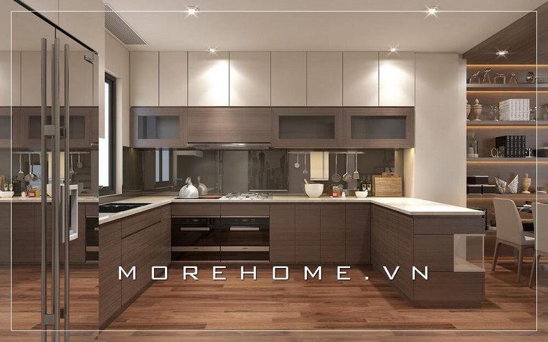 Tủ bếp gỗ công nghiệp hiện đại với thiết kế kiểu dáng chữ U kết hợp cùng các thiết bị phòng bếp đa năng sẽ giúp tạo ra không gian nấu nướng tiện nghi cho người nội trợ.