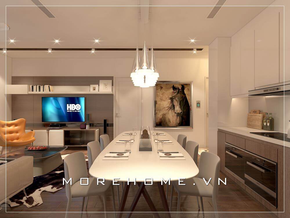 Thiết kế nội thất phòng ăn chung cư hiện đại, sắp xếp đồ đạc tiện nghi, gọn gàng mang đến không gian tiện lợi cho cả gia đình